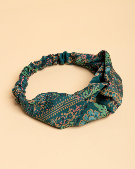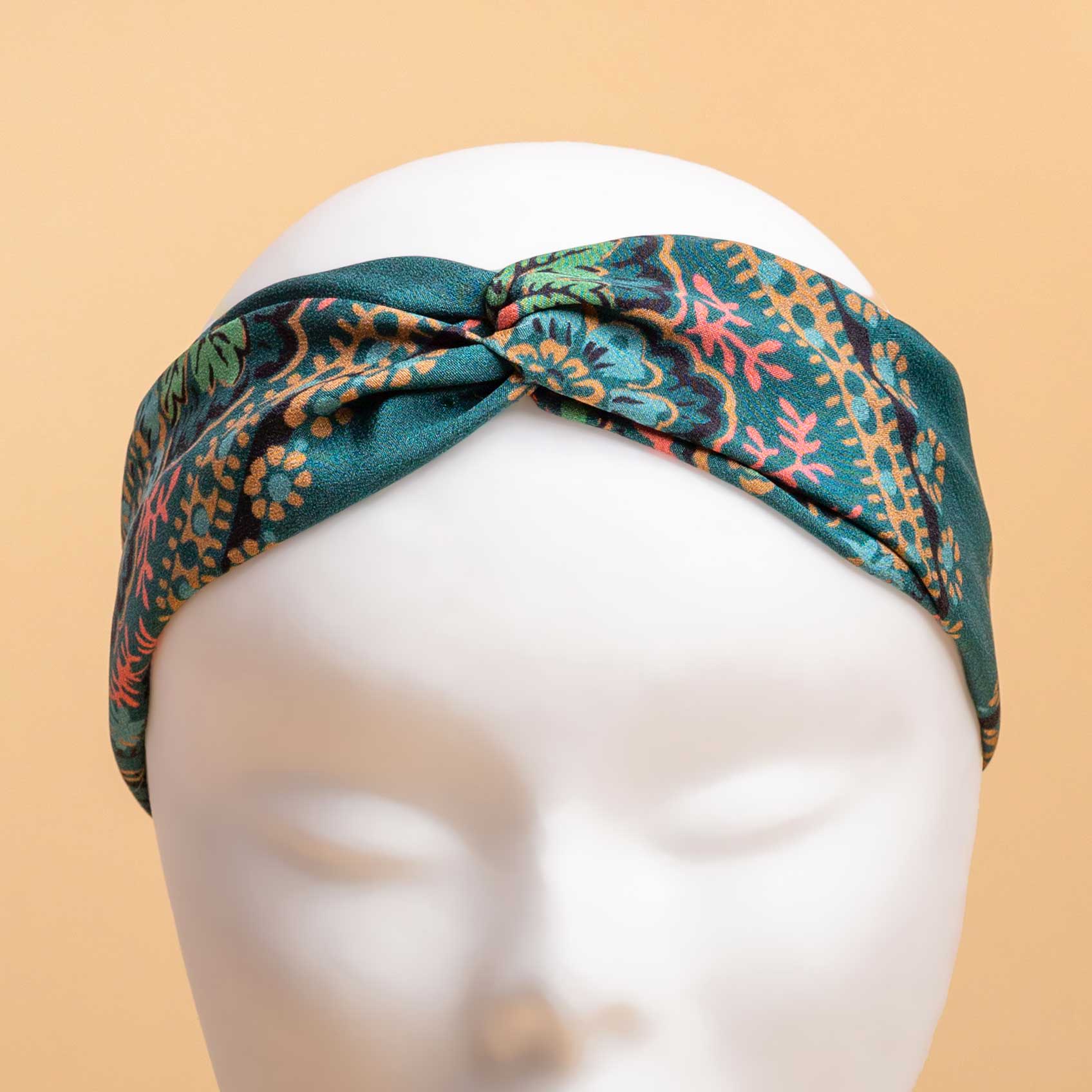 Fascia per capelli in seta color Ottanio con motivi floreali tradizionali dei Balcani