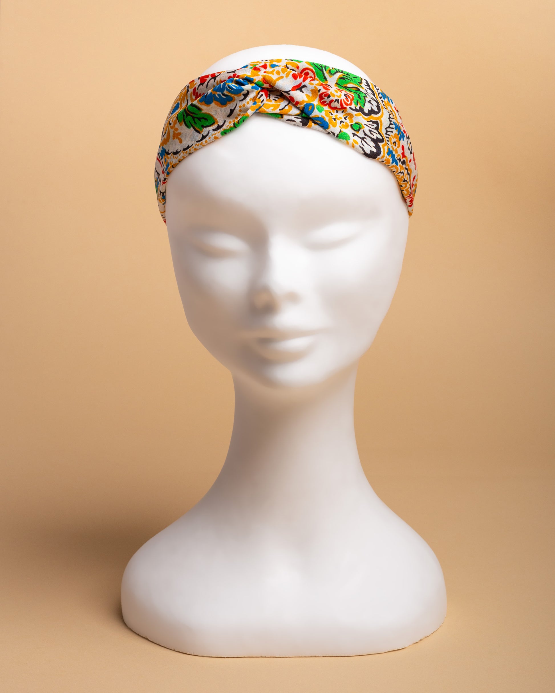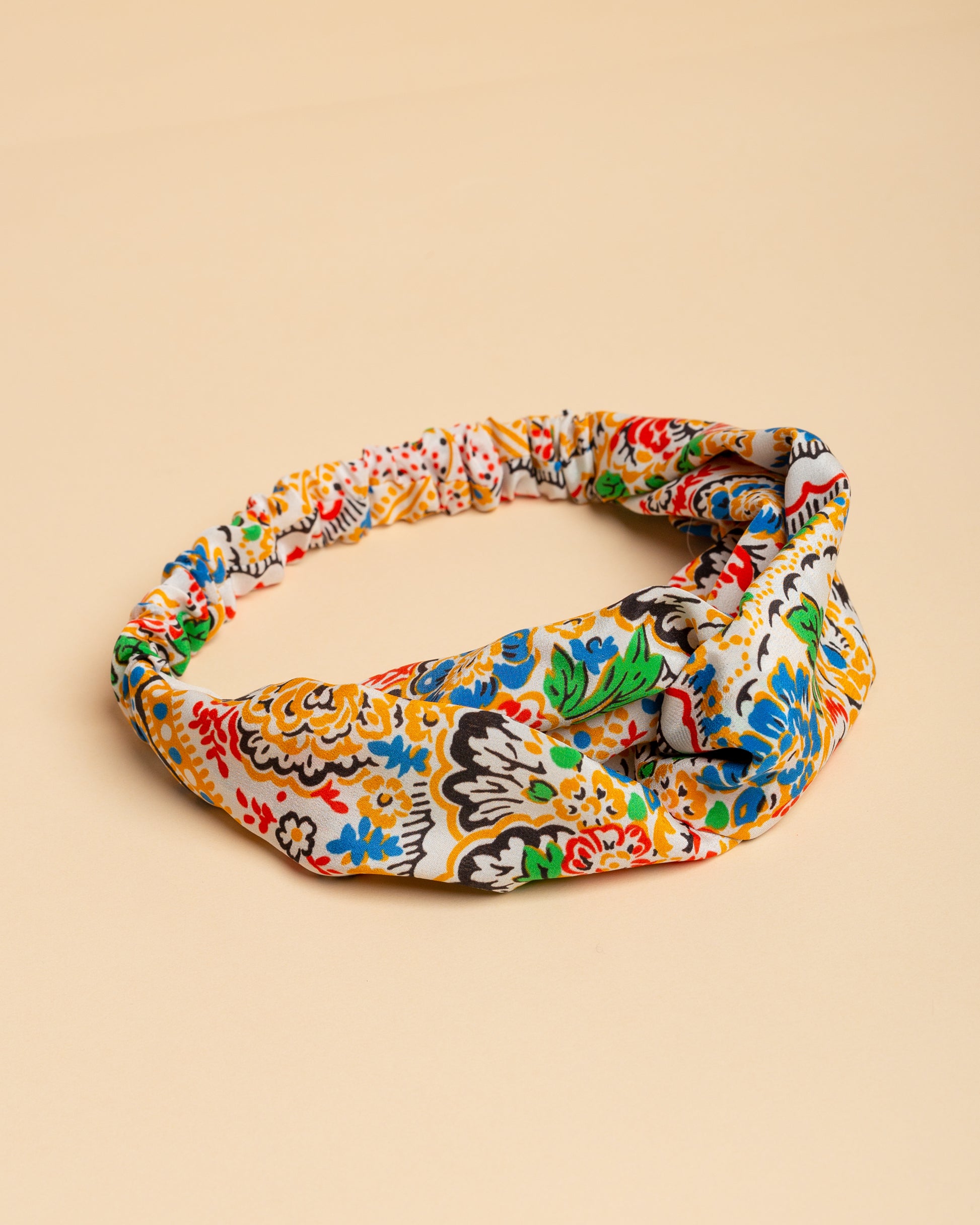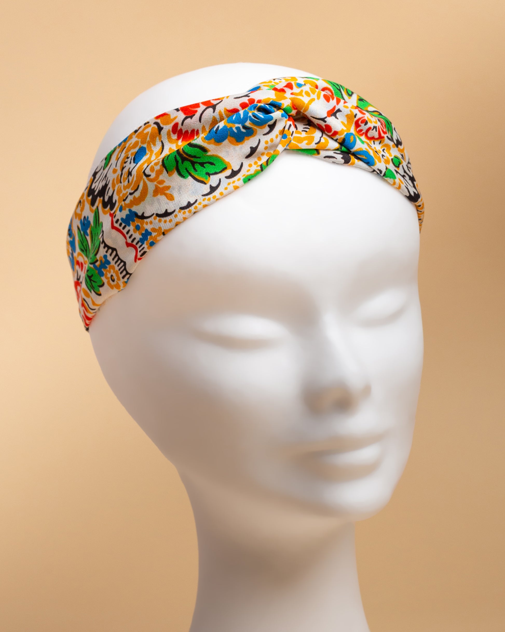 Fascia per capelli in seta crêpe de chine dal decoro senza tempo a motivi floreali.