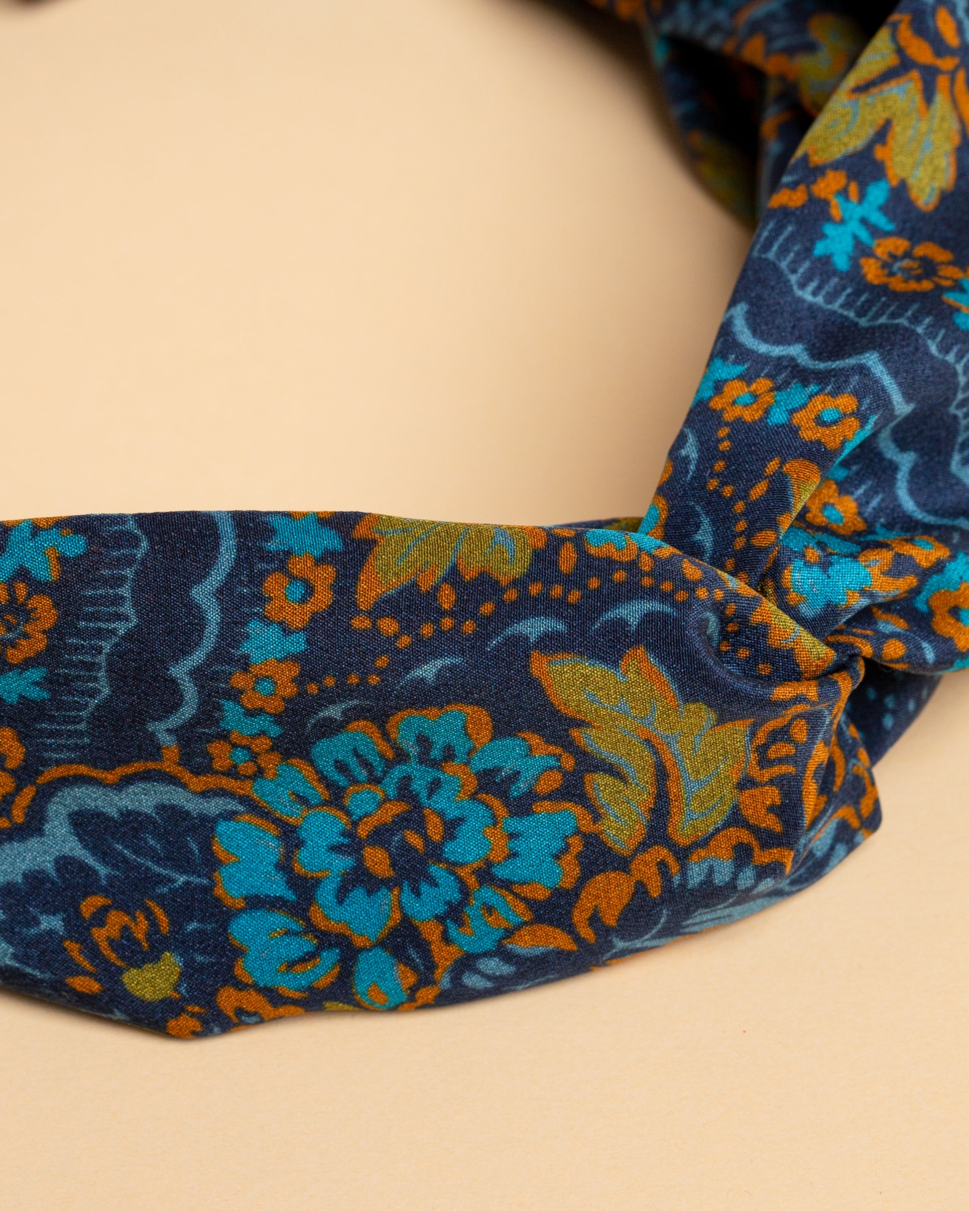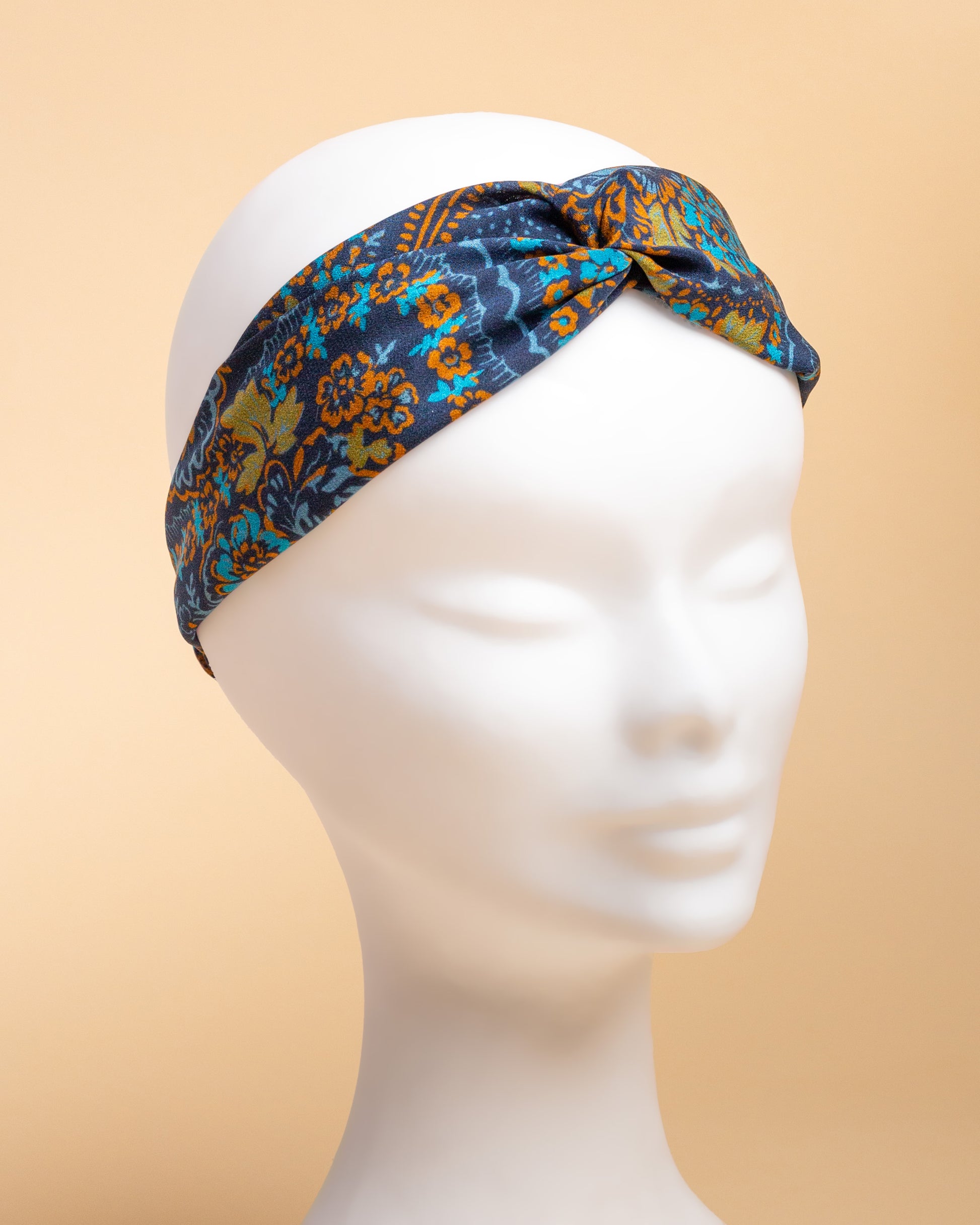 Fascia per capelli in seta crêpe de chine dal decoro senza tempo a motivi floreali.