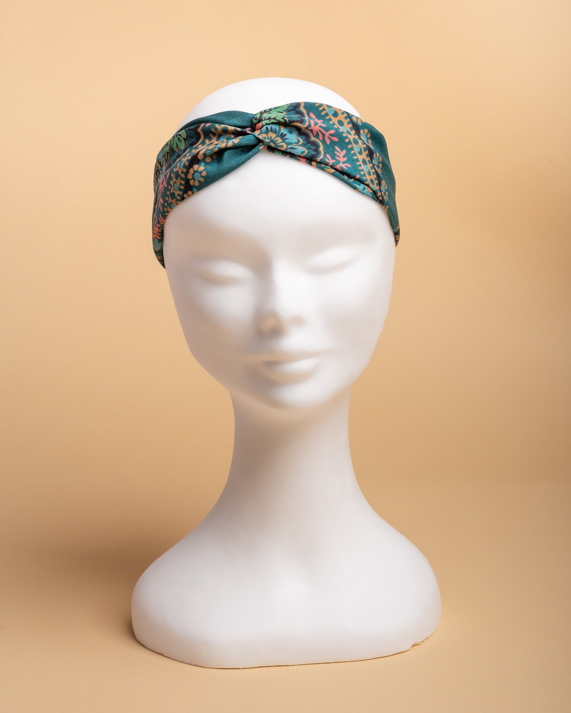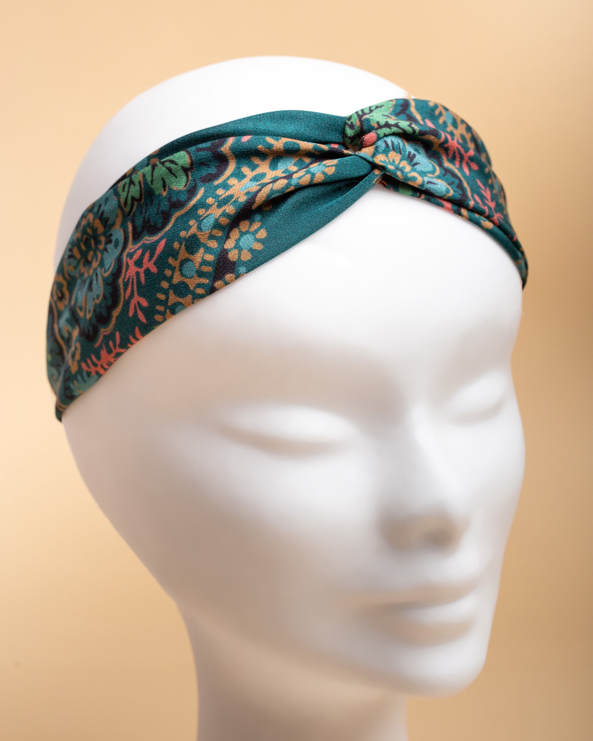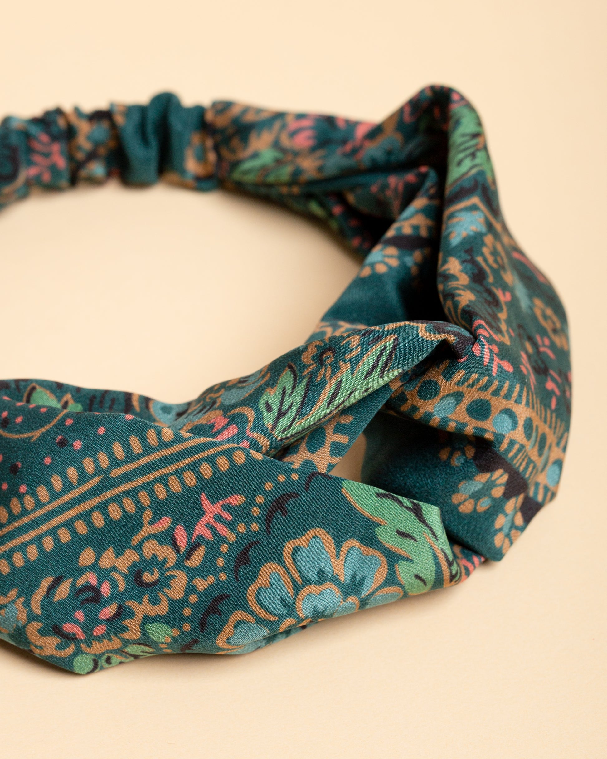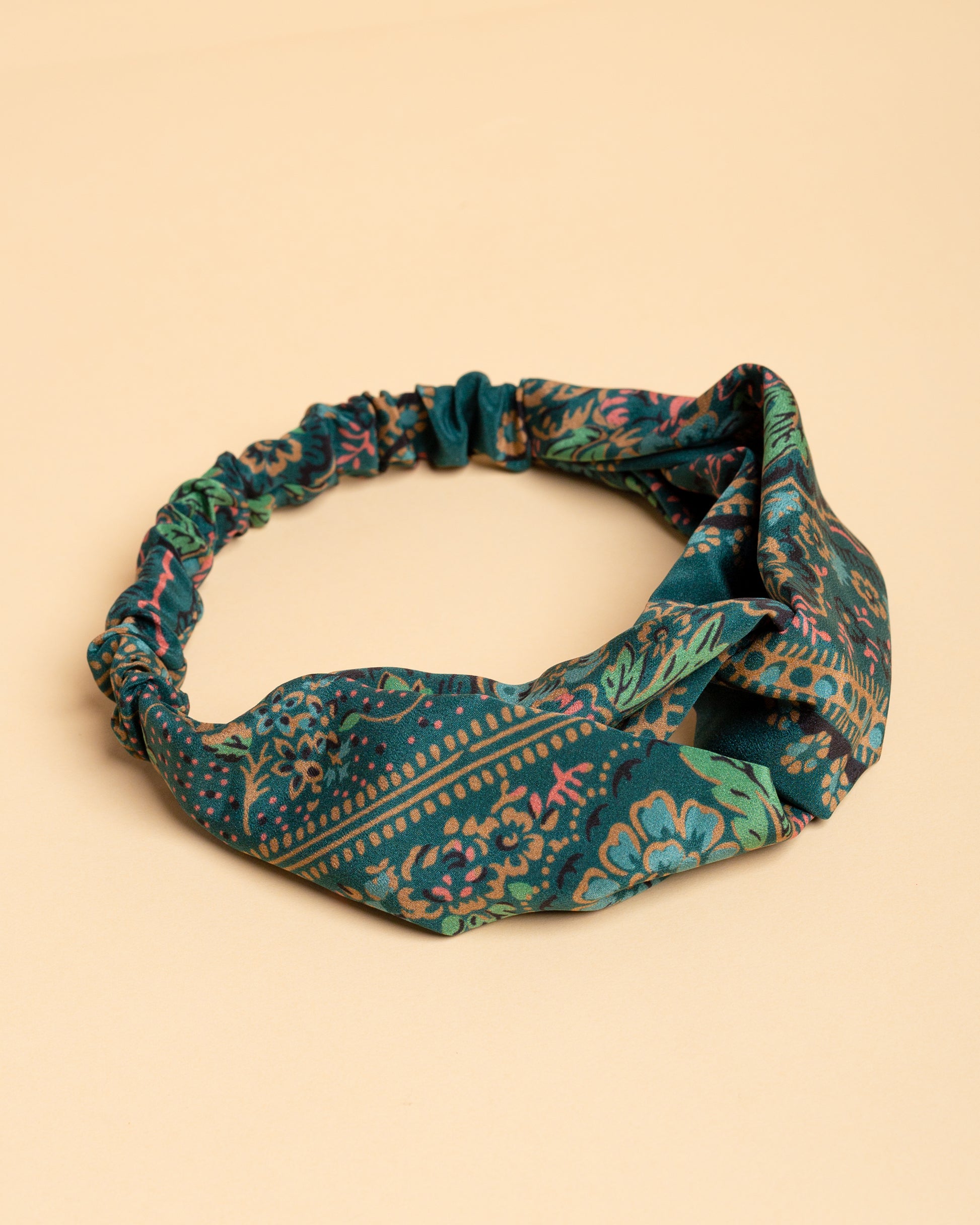Fascia per capelli in seta crêpe de chine dal decoro senza tempo a motivi floreali.